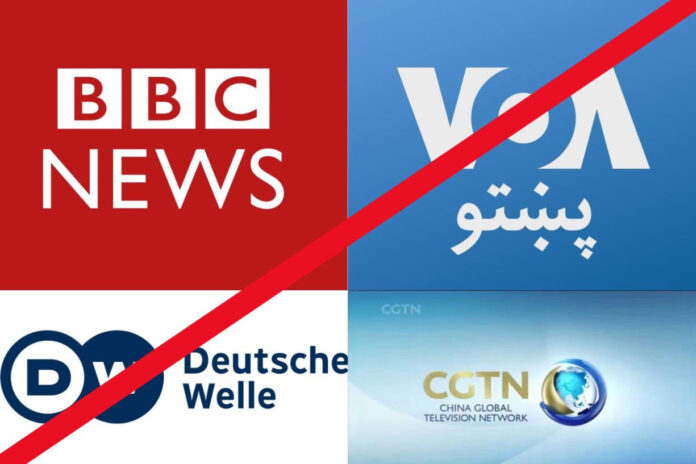 The same day, Voice of America (VoA), an American broadcaster that airs a half-hour news bulletin in Pashto and Dari languages, was barred from broadcasting its program produced for Afghan partners TOLOnews and Shamshad TV.