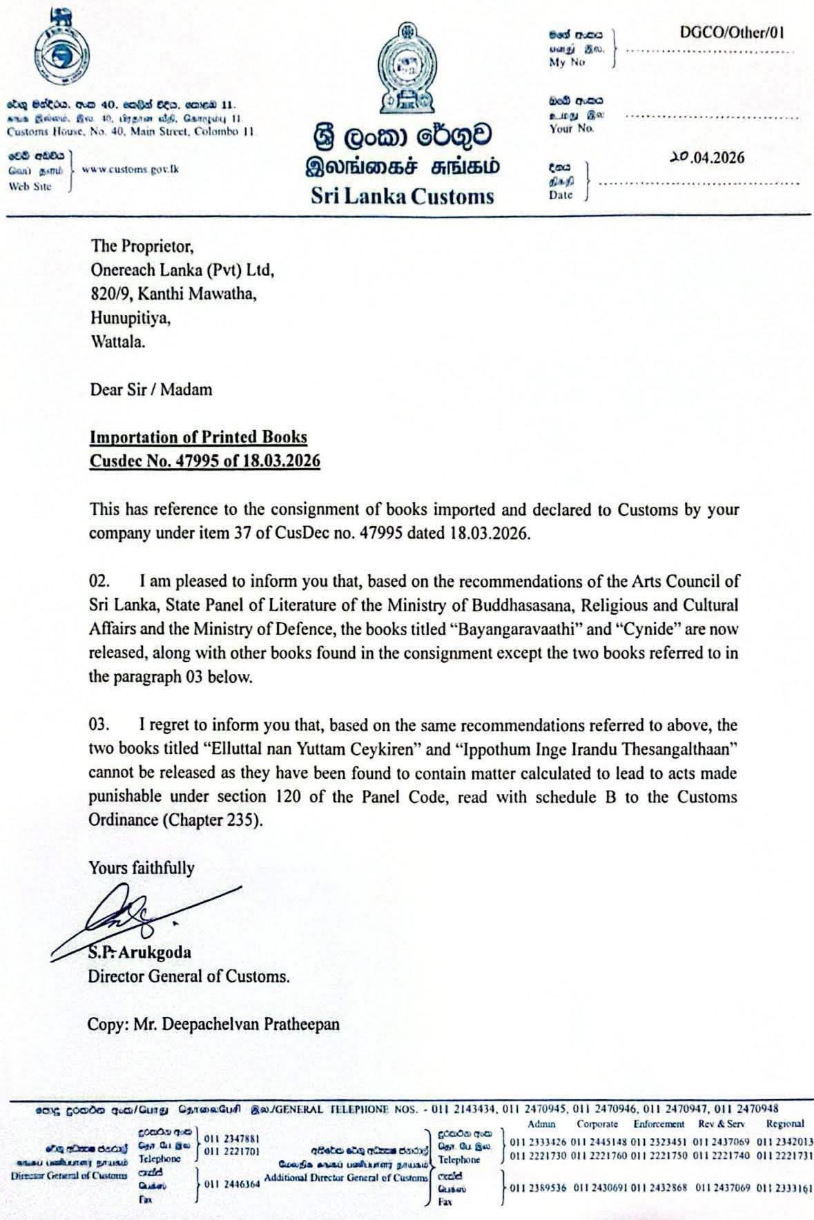 However, two books — “Elluttal nan Yuttam Ceykiren” and “Ippothum Inge Irandu Thesangalil” — have not been released. Authorities stated that these publications were found to contain material considered likely to lead to acts punishable under Section 120 of the Penal Code, read together with Schedule B of the Customs Ordinance (Chapter 235).