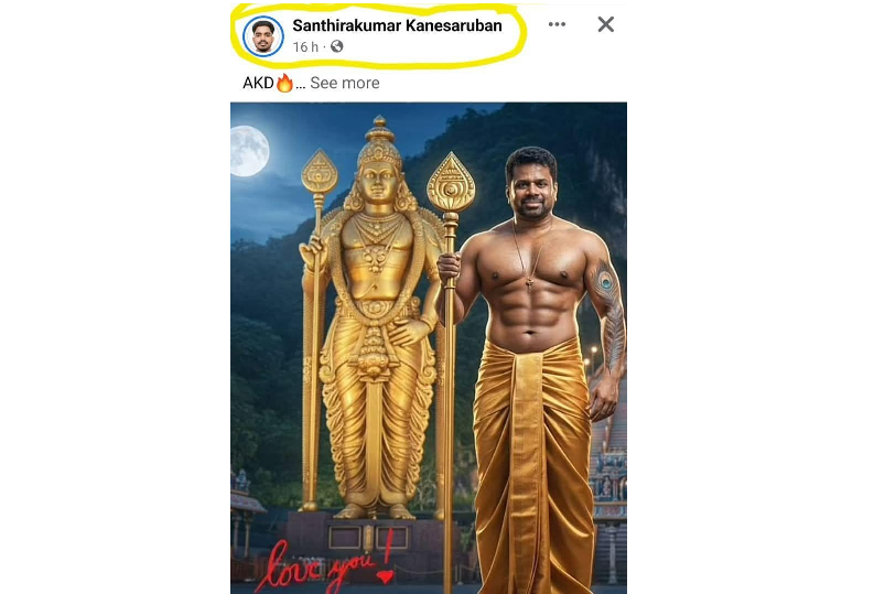 A JVP member and NPP Pradeshiya Sabha councillor from the Vadamaradchi South West Pradeshiya Sabha in Karaveddy has ignited a religious and political controversy in Jaffna after posting an AI-generated image depicting President Anura Kumara Dissanayake (AKD) holding a vel, the sacred spear associated with Lord Murugan (Kartikeya, Kataragama deviyo)