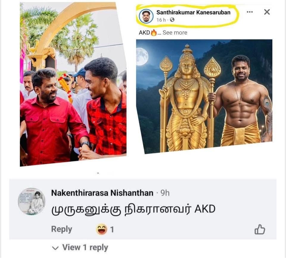 The councillor, Santhirakumar Kanesaruban, shared the image on social media with the Tamil caption, “AKD முருகனுக்கு நிகரானவர்” (“AKD is equal to Lord Murugan”). Shortly afterward, another NPP activist in Jaffna, Nakenthirarasa Nishanthan, echoed the sentiment with a similar post using identical wording, a trend that was subsequently picked up by several sudden NPP sympathisers in Jaffna. suggesting that political devotion, like the image itself, was rapidly auto-generated — powered less by faith than by fresh political opportunism.