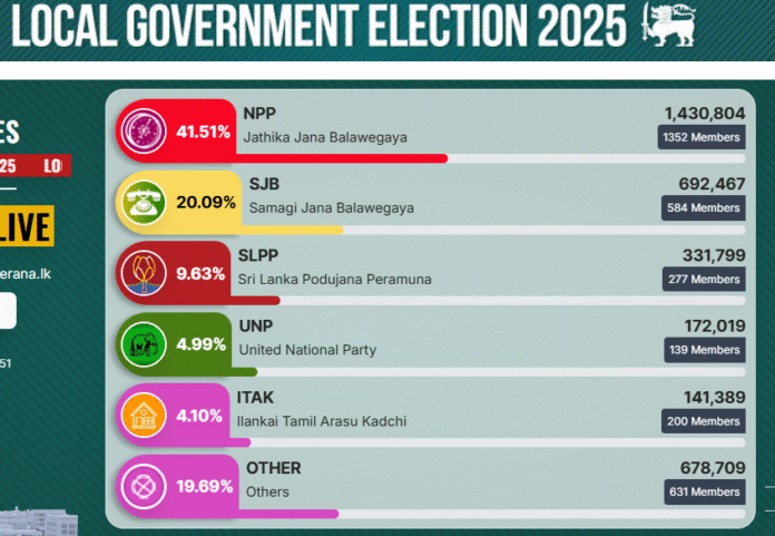 The National People’s Power (NPP) has emerged as the clear winner in Sri Lanka’s 2025 Local Government Elections, securing 4,503,930 votes (43.26%) and 3,927 seats nationwide.