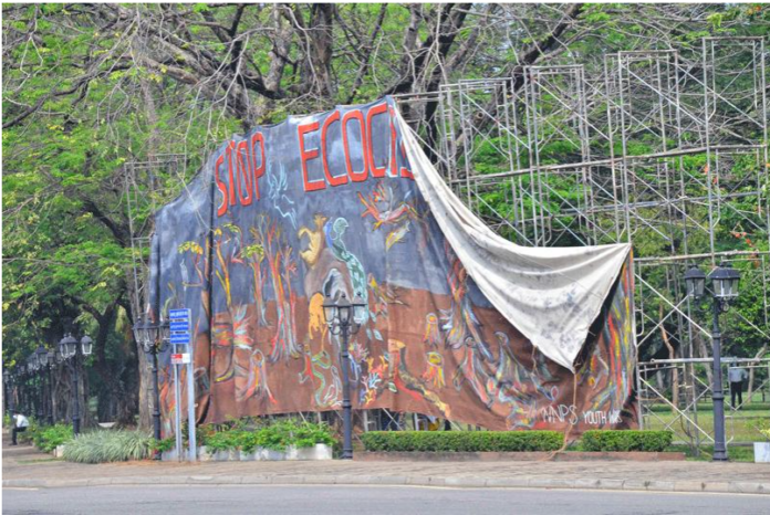 Following instructions issued by the President’s Office, workers from the Colombo Municipal Council had begun taking down a massive mural which had been put up near the Nelum Pokuna, at the Vihara Maha Devi Park, a short while ago, which was depicting the ecocide which is presently taking place in Sri Lanka.
