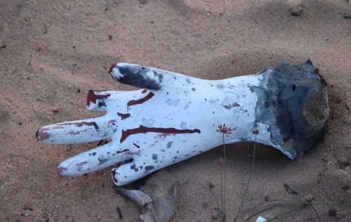 Image: A memorial monument, which depicts a pair of outstretched hands, had been broken off and tossed into the nearby sand. In recent years the monument was the site of annual memorials, with survivors of the massacres lighting flames of remembrance on it.- Tamil Guardian.