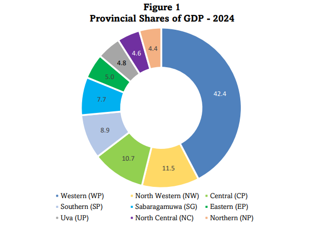 The Western Province continued to dominate Sri Lanka’s economy in 2024, accounting for 42.4% of nominal GDP, despite a slight decline from 44.0% in 2023. This concentration underscores the stark disparity between the highly urbanised Western Province—home to Colombo and its dense metropolitan infrastructure—and the largely rural provinces, where economic activity and living standards lag behind.