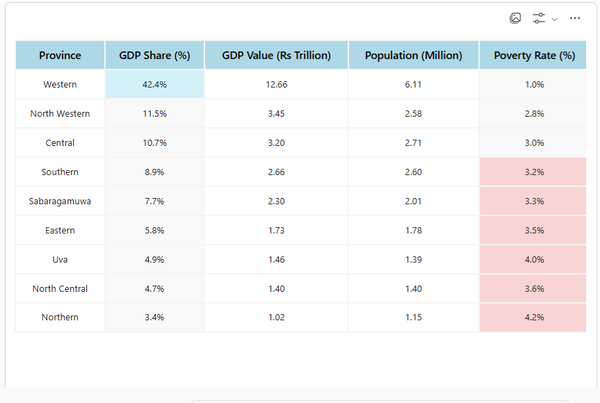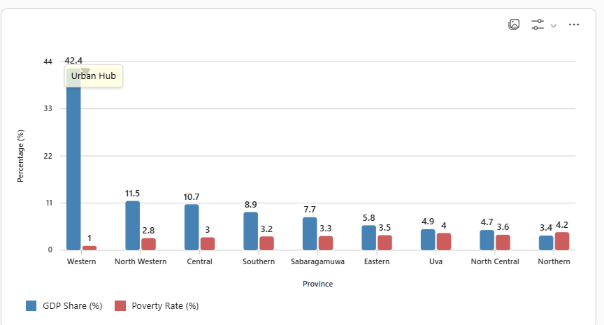 - Rural provinces like Northern and Uva have higher poverty rates (4%+) and much smaller GDP contributions.