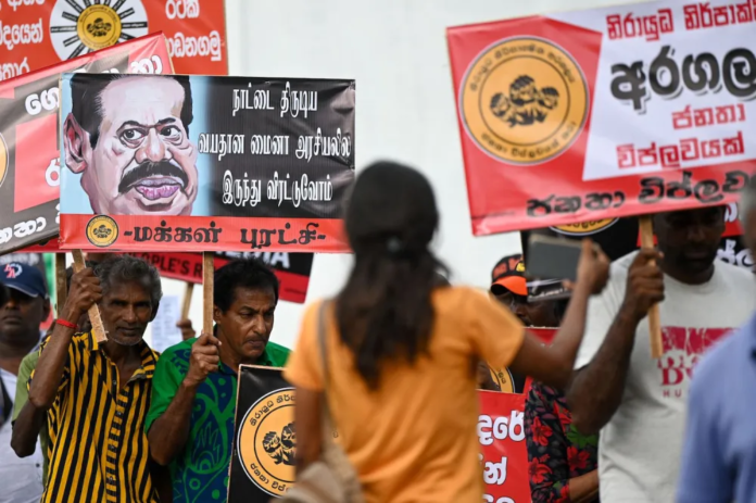 Image: People’s Revolution party activists hold placards during a demonstration in Colombo, Sri Lanka, on Aug. 11. ISHARA S. KODIKARA/AFP VIA GETTY IMAGES